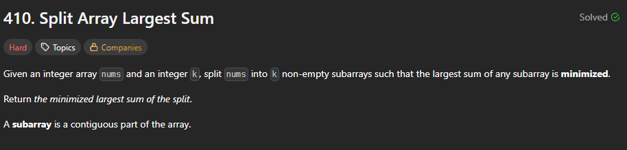 이분탐색 문제이다.너무 이분탐색이라 설명을 건너뛰고 주석으로 설명한다.class Solution { public int splitArray(int[] nums, int k) { int lo = 0; for(int i = 0; i upperbound){ now = 0; nowSubArrCnt++; // 배열의 수가 k개보다 많아지면 실패 if(nowSubArrCnt == k) return false; } now += nums[i]; } return true; }}