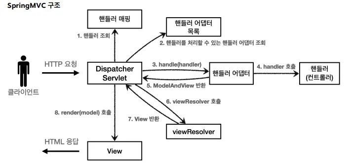 DispatcherServlet의 doDispatch() 동작구조DispatcherServlet 구조라이브러리 : org.springframework.web.servlet.DispatcherServletDispatcherServlet도 부모 클래스에서 HttpServlet을 상속받아서 사용하고, 서블릿으로 동작한다.DispatcherServlet → FrameworkServlet → HttpServletBean → HttpServlet스프링 부트는 DispatcherServlet 을 서블릿으로 자동으로 등록하면서 모든 경로( urlPatterns="/" )에 대해서 매핑한다.참고: 더 자세한 경로가 우선순위가 높다. 그래서 기존에 등록한 서블릿도 함께 동작한다요청 흐름서블릿이 호출되면 HttpServle..