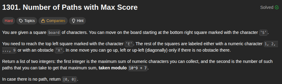 public int[] pathsWithMaxScore(List<String> board) {